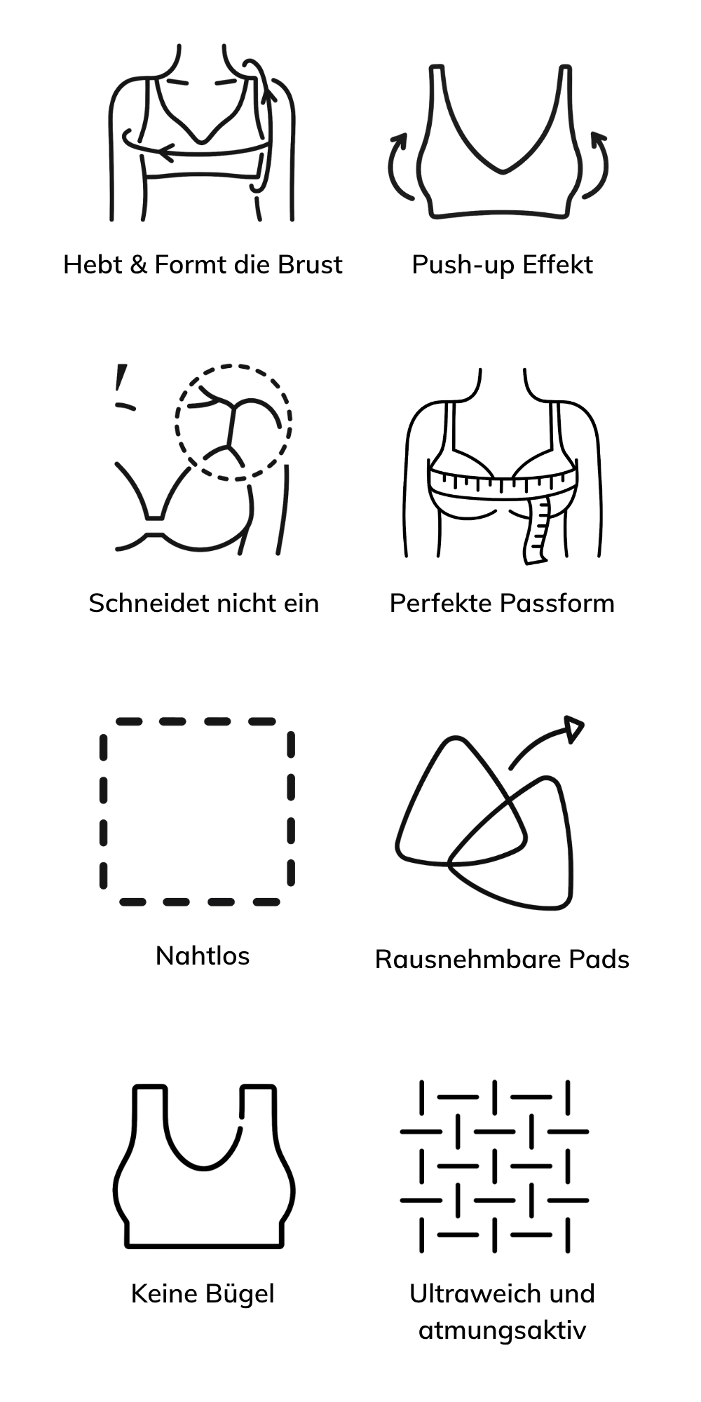 Dieser BH wurde für Frauen entwickelt, die sich nach maximalem Komfort und uneingeschränkter Bewegungsfreiheit sehnen. Ob als Alltags-BH, T-Shirt-BH, Camisole-BH, Schlaf-BH, Yoga-BH oder für leichte Sportarten – er passt sich deinem Leben an.