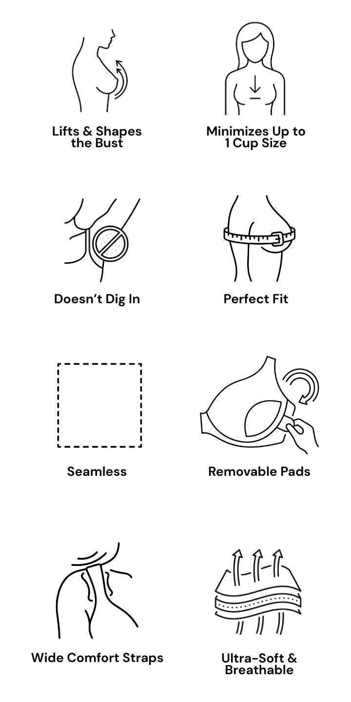 The bra you'll forget you're wearing—until you look in the mirror. The NoFeel Minimizer Bra reduces your bust by up to one cup size while delivering all-day comfort that feels like nothing at all.